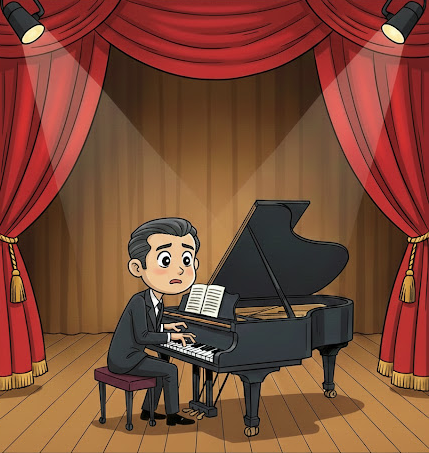 この時点でかなり混乱していましたが、まだ思考力は残っていました。「よし、今1オクターブ高いのだから、次のフレーズから1オクターブ下げれば元に戻るはずだ。」さっそく実行に移しました。するとなんと、右手と左手がぶつかってしまったのです。「どういうことだ?」もう、完全にパニックに陥りました。そこからは指が震えだし、もう思うように動きません。何度も音を外し、その度に一旦停止し、なんとか1オクターブ下げて正常に戻ろうとするのですが、そのたびに右手と左手がぶつかります。まあ、なんとか最後まで弾き切ったものの茫然自失状態で、一体何が起きたのかしばらく理解できませんでした。
